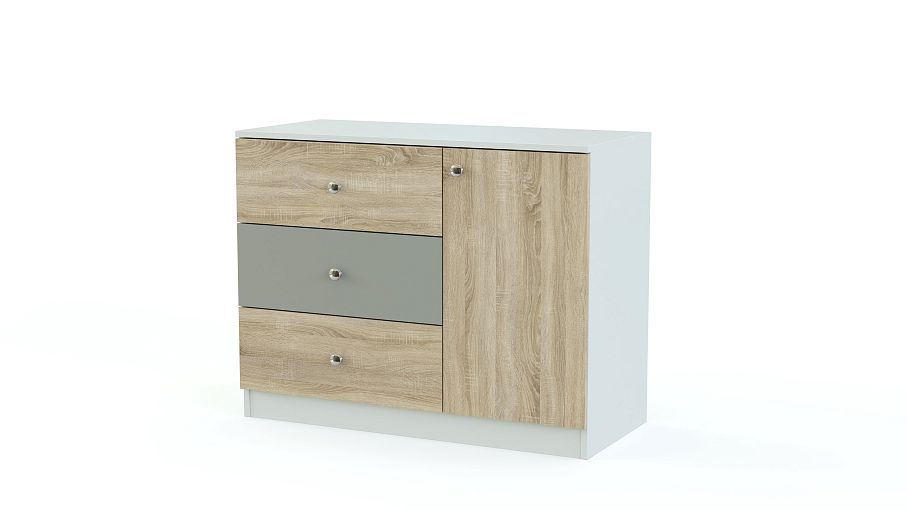 Комод Алиса 2 BMS станет незаменимым предметом меблировки современной детской. Яркая модель в нейтральных древесных тонах с серой вставкой проста по форме и удобна в эксплуатации. Комбинированный комод оборудован широкой столешницей, на которой смогут разместиться декоративные предметы, тремя выдвижными бельевыми ящиками и распашным отделением для книг, игрушек, уходовых средств и многого другого. Купить комод Алиса 2 BMS и дополнить модульный гарнитур практичной деталью вам поможет наш интернет-магазин.