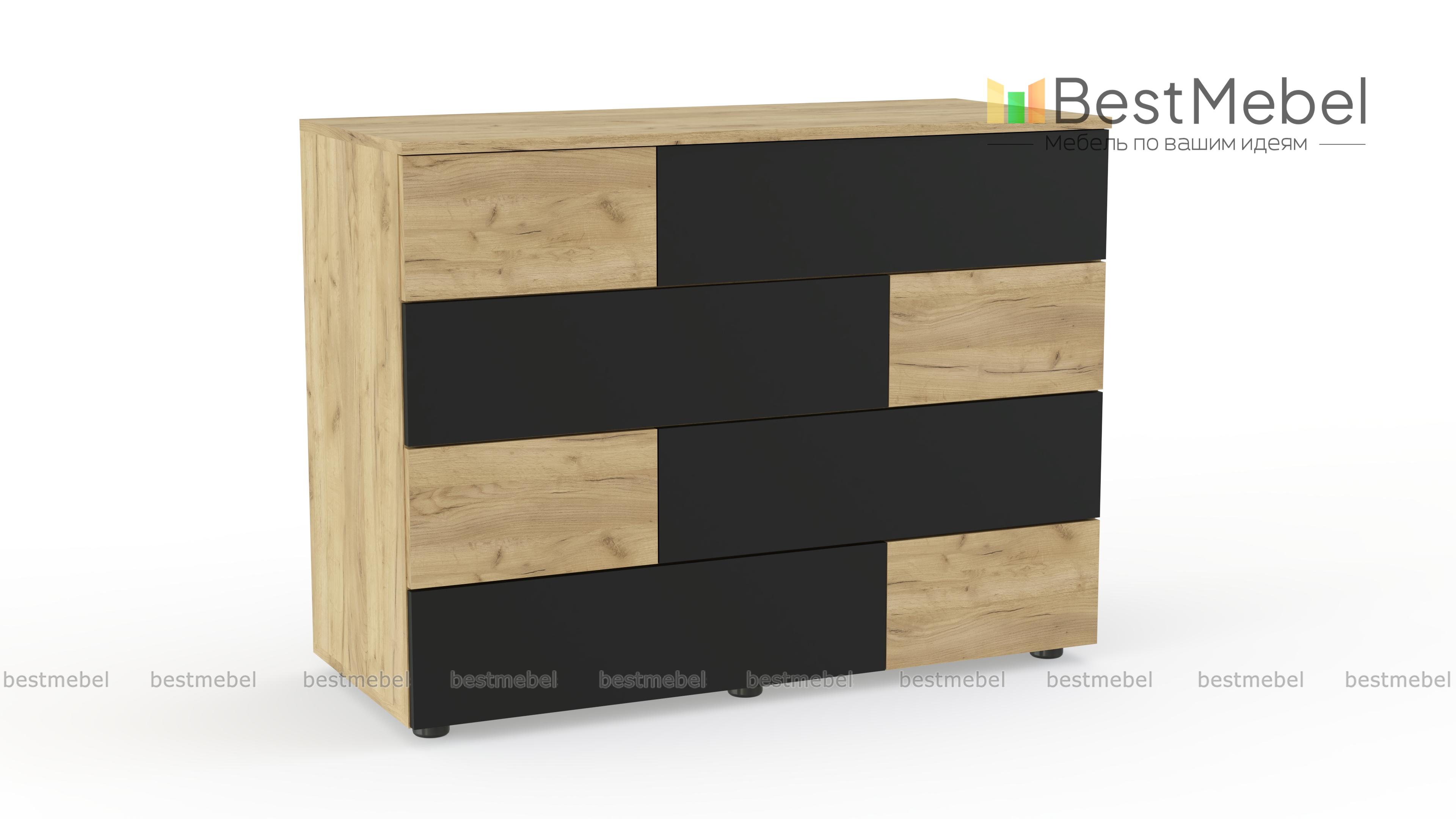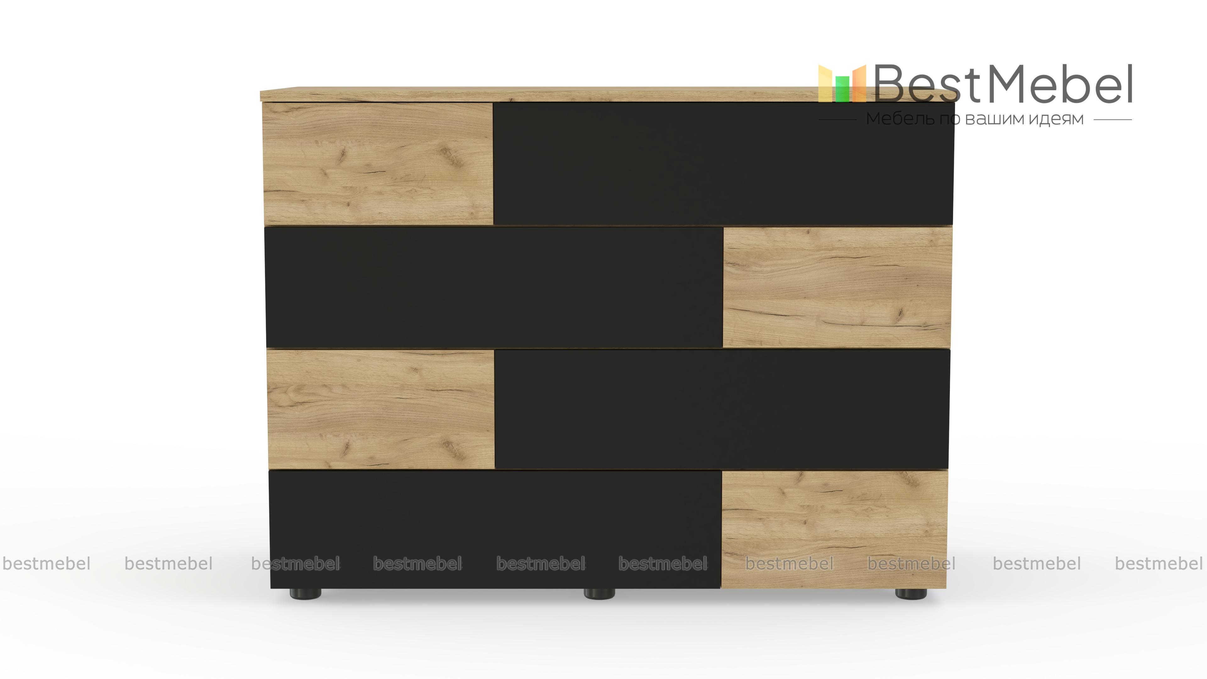 Комод Ежевика 12 BMS с трендовым графичным дизайном дополнит уютный лофт или интерьер в экостиле. На фоне корпуса в теплом крафтовом оттенке выделяются контрастные темные вставки. Расположенные в четыре яруса большие и маленькие выдвижные ящики легко решают проблему хранения текстиля, аксессуаров и множества бытовых мелочей, а на столешнице достаточно места для декора. Купить комод Ежевика 12 BMS с возможностью изготовления по вашим размерам приглашаем в наш интернет-магазин.