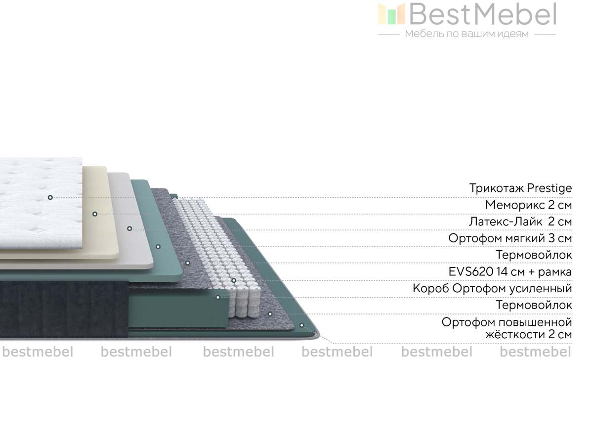 Состав: Меморикс 2см(Ортофом (ППУ) с эффектом памяти) \ Латекс-Лайк (ППУ) 2 см \ Ортофом (ППУ) мягкий 3 см \ Термовойлок \ EVS620 14см \ рамка к ПБ \ Термовойлок \ Ортофом (ППУ) повышенной жесткости 2см \ Короб усиленный (ВППУ).