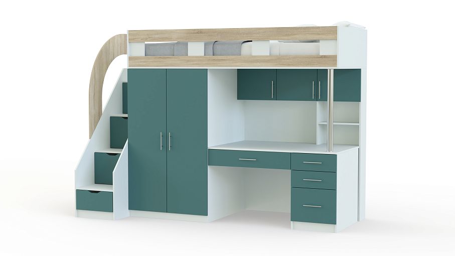 Кровать-чердак с рабочей зоной Мираж 5 BMS отличается современным дизайном, компактными размерами и функциональностью. Вы сможете обустроить комфортную зону отдыха, полноценное рабочее место и аккуратно разместите вещи ребенка. В комплекте кровать с защитным бортиком, лестница-комод, распашной шкафчик для одежды и письменный стол с выдвижными ящиками для мелочей и надстройкой с полками. Купить кровать-чердак с рабочей зоной Мираж 5 BMS приглашаем выгодно в наш интернет-магазин.
