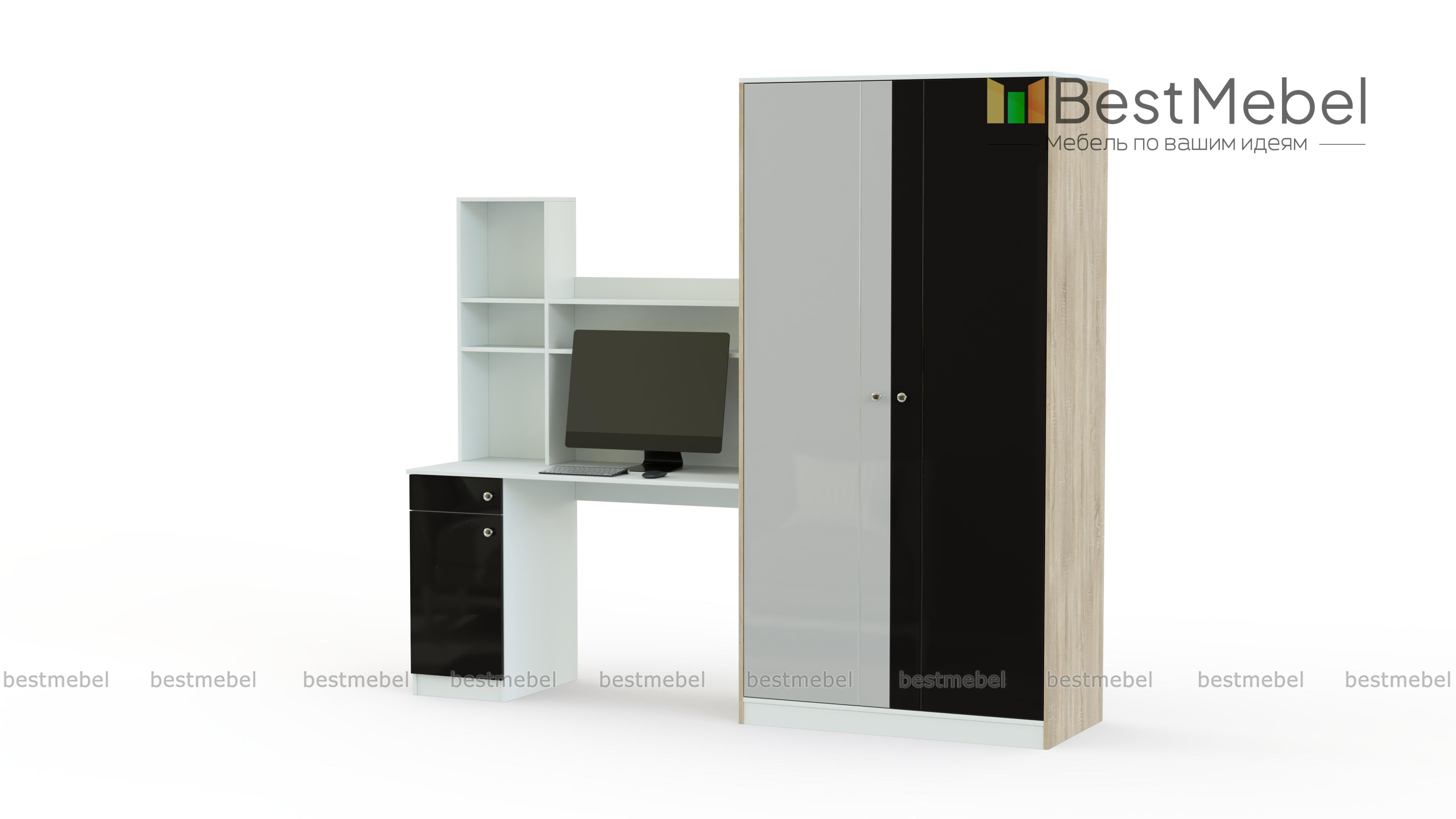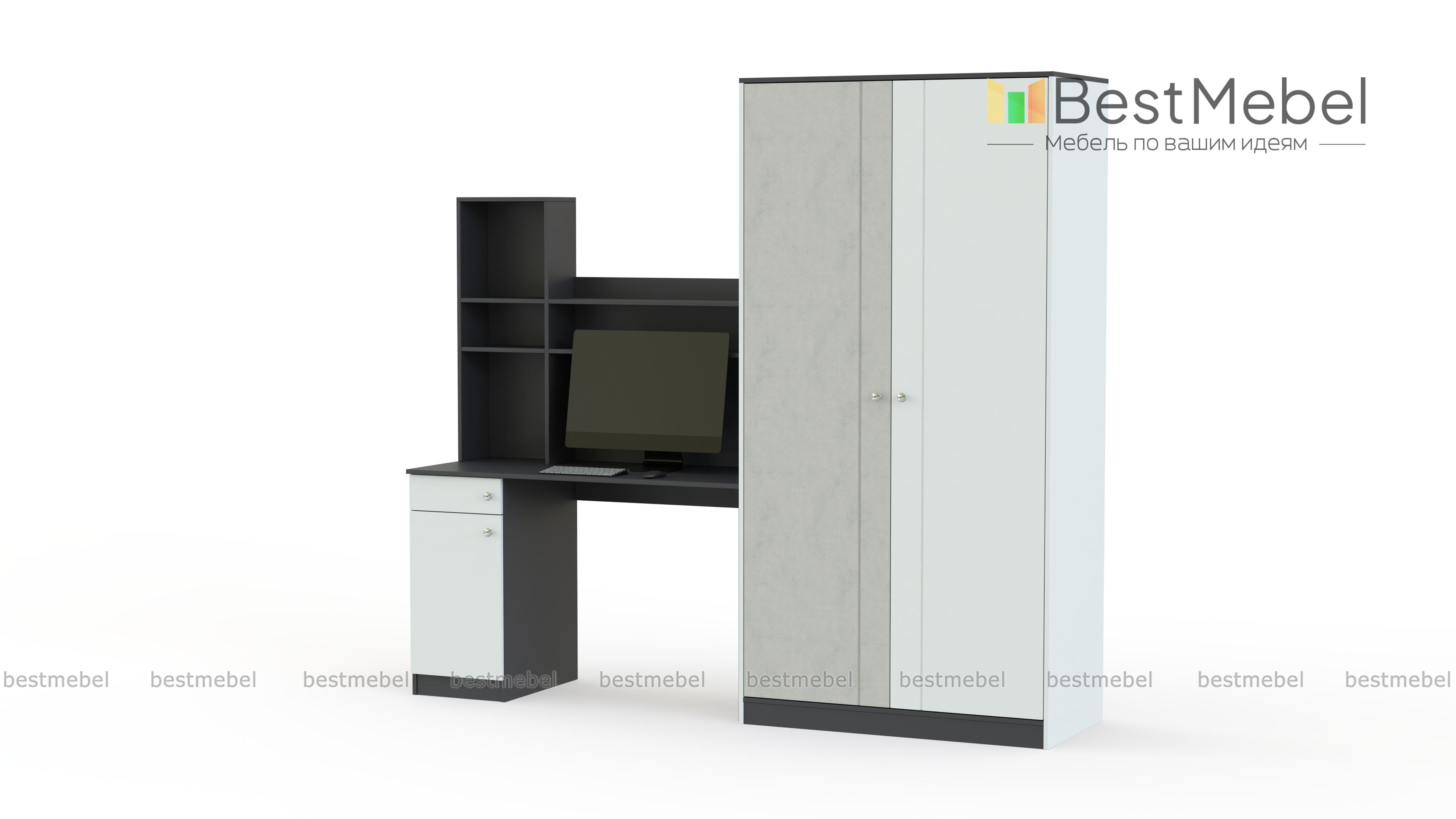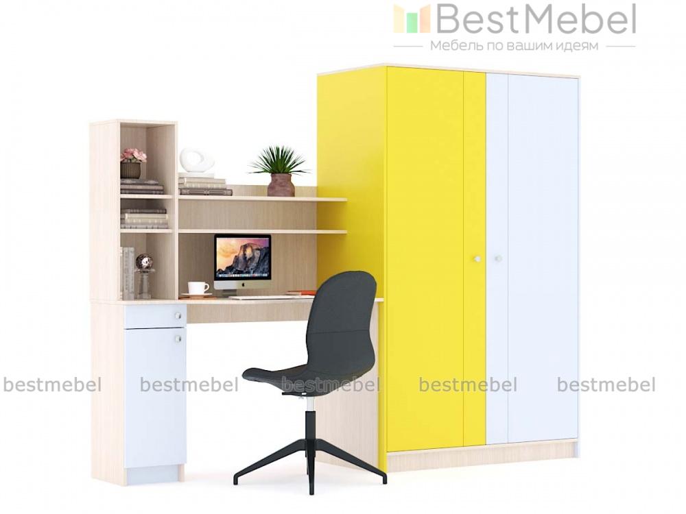 Детская стенка Сплинни 1 BMS объединила вместительный платяной шкаф с компьютерным столом, оборудованным тумбой и надстройкой. Модель позволяет грамотно спланировать пространство детской и освободить место для игр. В оформлении разноуровневой стенки использованы спокойные нейтральные оттенки, контрастные вставки и неброская вертикальная фрезеровка. Купить детскую стенку Сплинни 1 BMS приглашаем в наш интернет-магазин с возможностью выбора цвета и размеров.