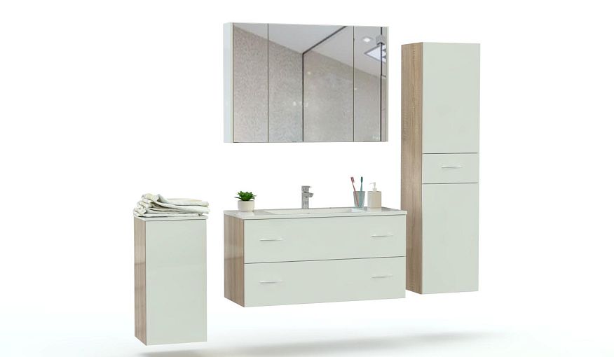 Комплект для ванной Мист 2 BMS эффектно сочетает в оформлении белый и древесные оттенки. Минималистичная композиция включает в себя тумбу под раковину с двумя широкими выдвижными ящиками, узкую распашную тумбу, пенал и зеркальный шкаф. Вы сможете компактно разместить все необходимые уходовые средства, банный текстиль и аксессуары, а подвесная конструкция модулей визуально облегчит интерьер. Купить комплект для ванной Мист 2 BMS приглашаем в наш интернет-магазин с выбором цвета и фурнитуры по каталогу.