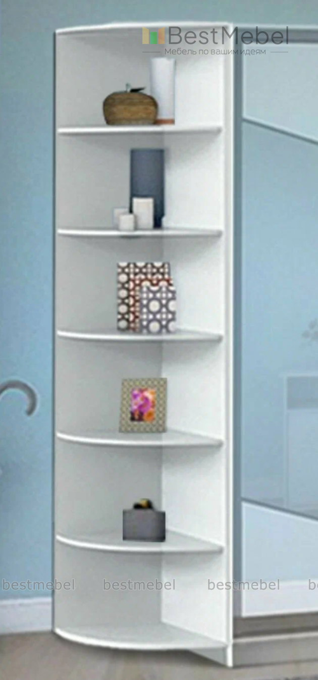 Угловой элемент к шкафу – это модель, оборудованная шестью радиусными полками. Практичная конструкция позволяет эффективно использовать пространство, а безопасность обеспечит отсутствие острых углов. Открытые полки оптимальны для размещения папок с документами, предметов декора и необходимых в зоне быстрого доступа мелочей. Купить угловой элемент вы сможете в нашем интернет-магазине от производителя BestMebelShop!