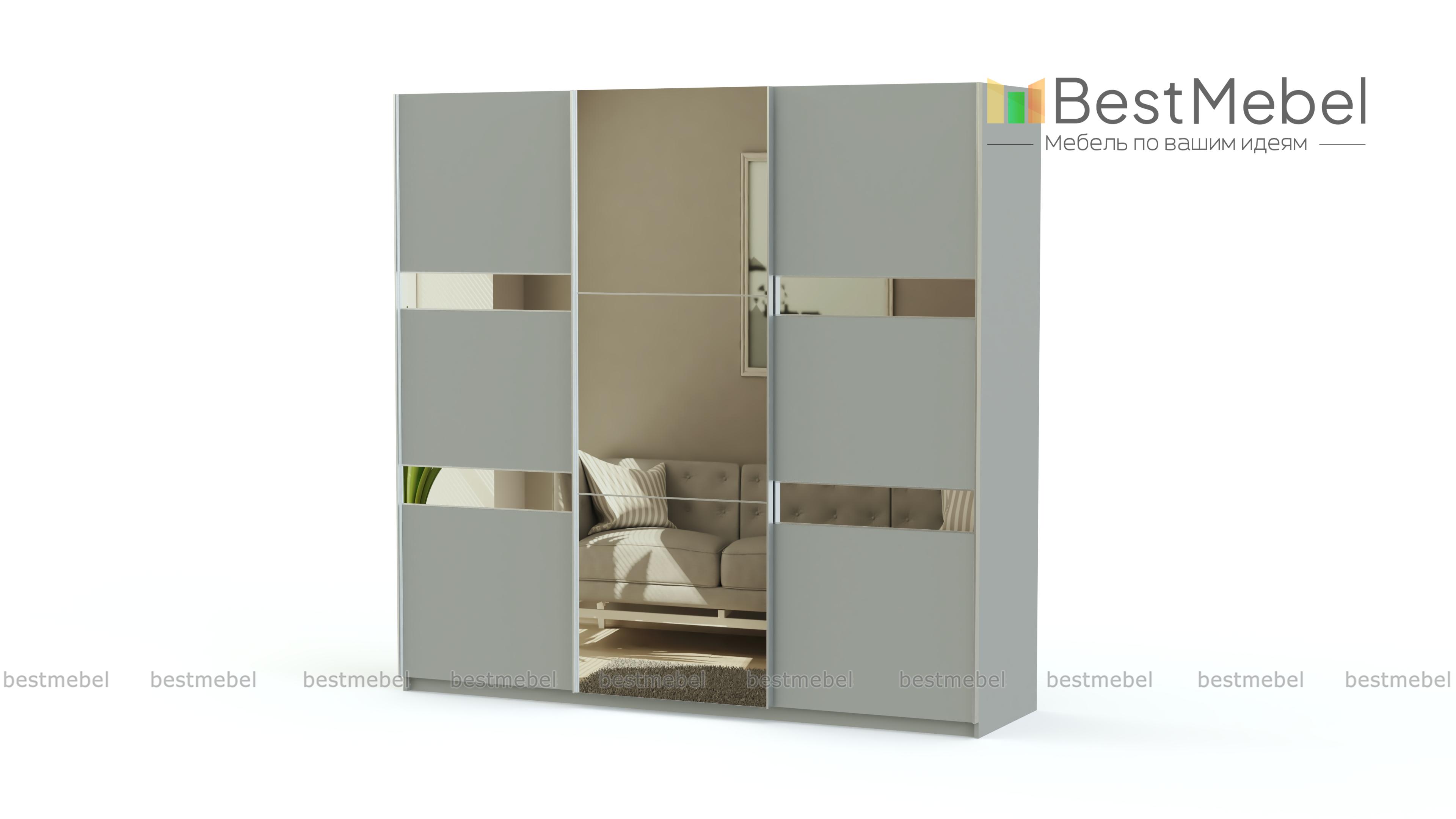 Современный шкаф-купе с оригинальным дизайном. Трехдверный фасад с горизонтальным делением выделен контрастными цветами и зеркалами. Такой шкаф будет одинаково хорошо смотреться в гостиной и прихожей. Конструкция предусматривает наличие вместительных полок, отделений со штангами и 4 выдвижных ящиков для хранения мелких вещей. Здесь найдется место для верхней одежды, платьев и сорочек, постельного белья, дорожных сумок, коробов, зонтов и многого другого, что часто загромождает углы квартиры.