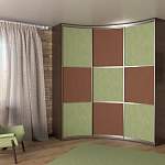 Шкаф-купе радиусный Родион 3 BMS – это эффектная трехдверная модель для просторной спальни. Крупногабаритная конструкция не смотрится громоздко благодаря угловой конструкции и необычной формы вогнутому фасаду. Продумав внутреннее наполнение, вы сможете компактно разместить большое количество вещей и сэкономить на лишней мебели. Раздвижные дверцы шкафа декорированы расположенными в шахматном порядке вставками шоколадного цвета и яркими вставками зеленого оттенка. Купить шкаф-купе радиусный Родион 3 BMS по отличной цене приглашаем на сайт нашего интернет-магазина.