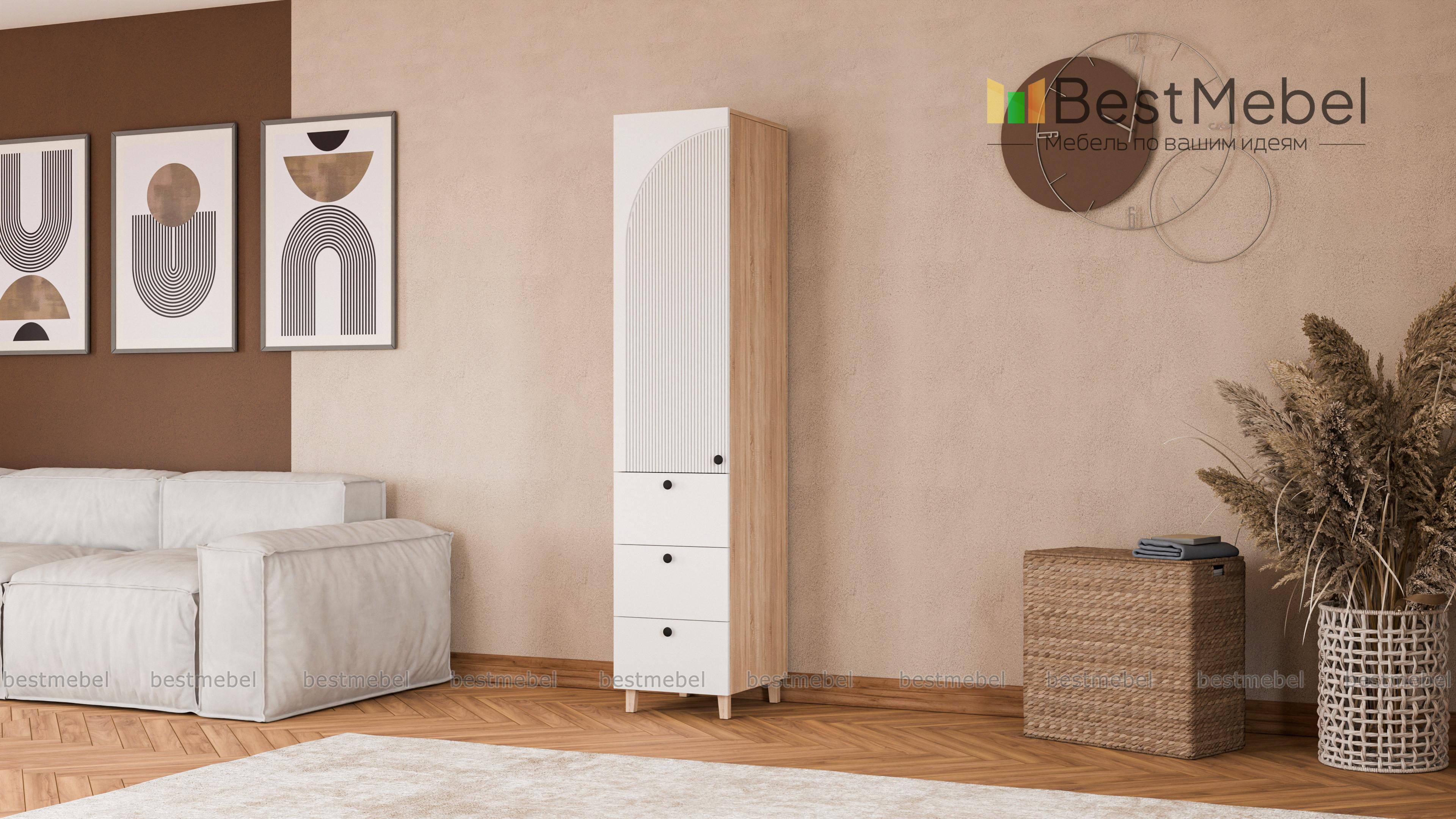Шкаф-пенал Вивьен 1 BMS с опорами в стиле сканди универсален и отлично справляется с хранением одежды и текстиля для дома, учебных пособий, игрушек и кухонной утвари. Под распашной секцией с полками расположились три вместительных ящика с легким выдвижением. Покрытие корпуса и фасада отличается износостойкостью, а для декора использована стильная асимметричная фрезеровка. Купить шкаф-пенал Вивьен 1 BMS с выбором размеров, цвета и фурнитуры вы сможете недорого в нашем интернет-магазине.