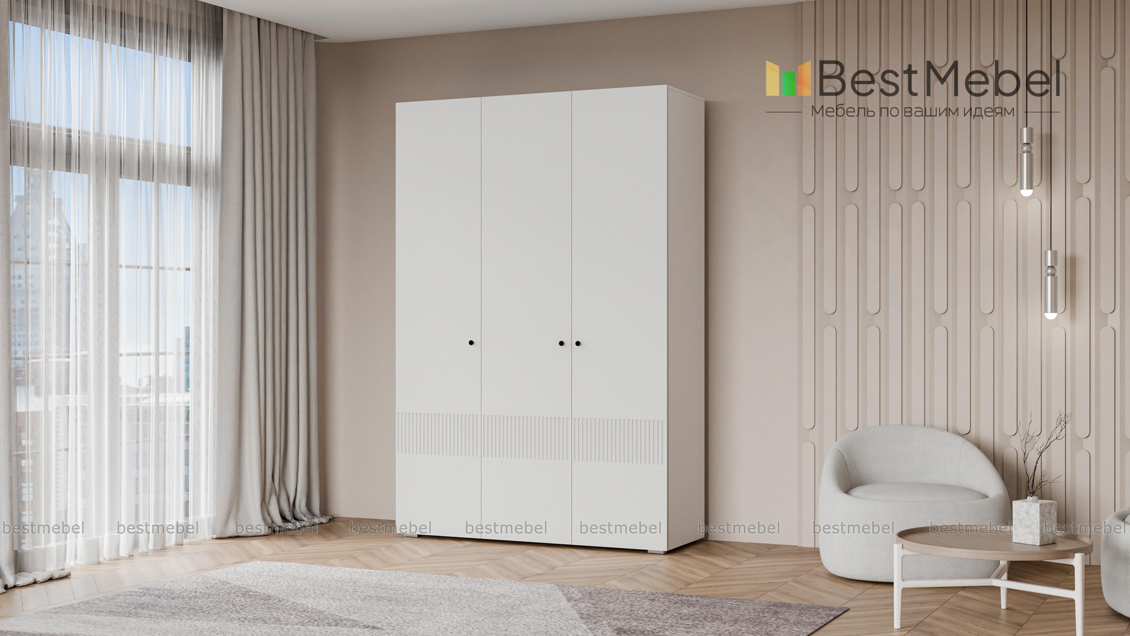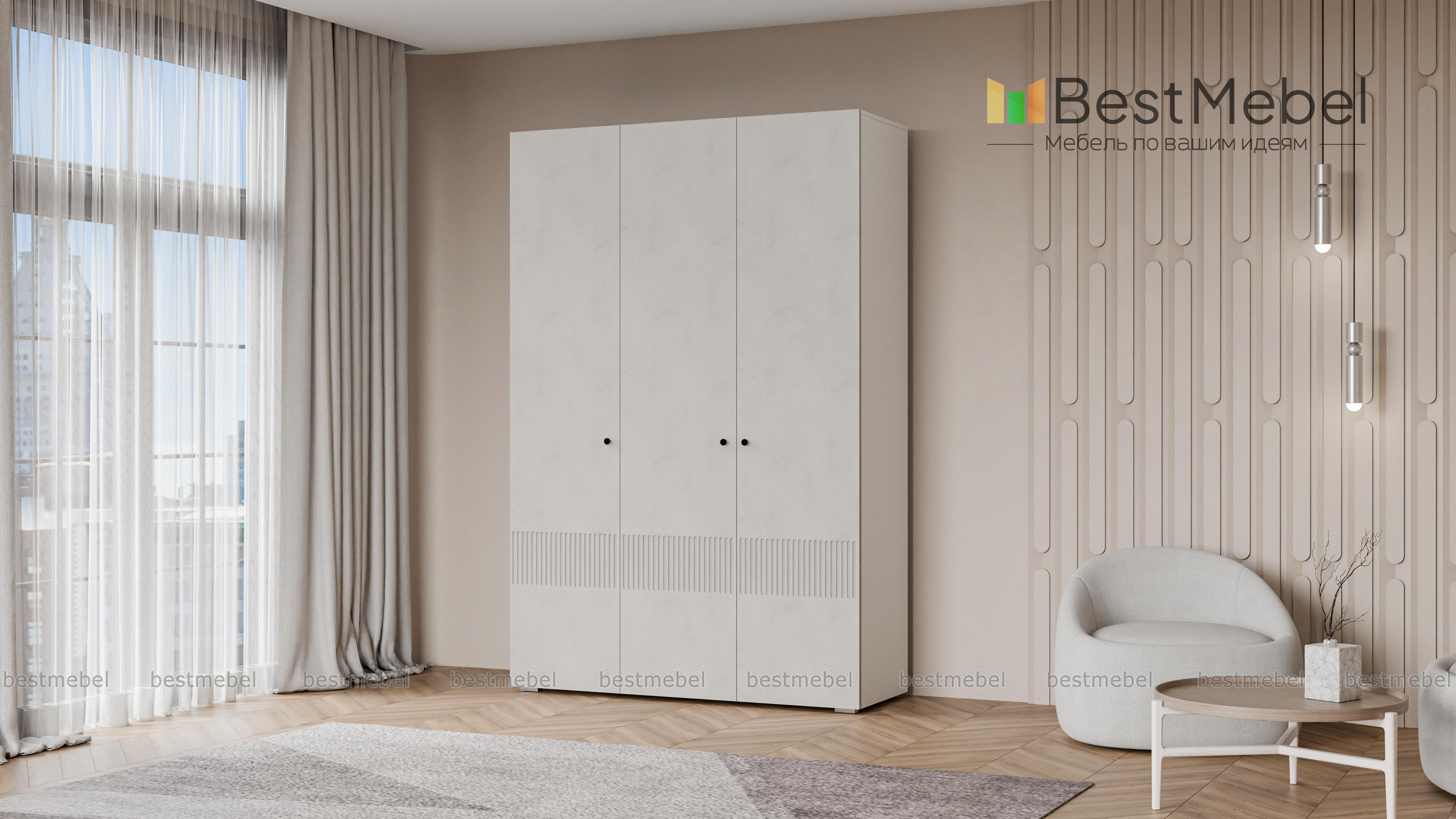 Шкаф распашной Джосс 3 BMS — компактный и стильный в двух актуальных оттенках. В отделке сплошного фасада, выполненного из устойчивой к повреждениям МДФ, использован оригинальный рельеф, дверцы легко открываются с помощью маленьких круглых ручек. Для разных вариантов хранения в трехдверной модели предусмотрены как штанга, так и секция с полками. Купить шкаф распашной Джосс 3 BMS с выбором размеров, цвета и фурнитуры вы сможете в нашем интернет-магазине.