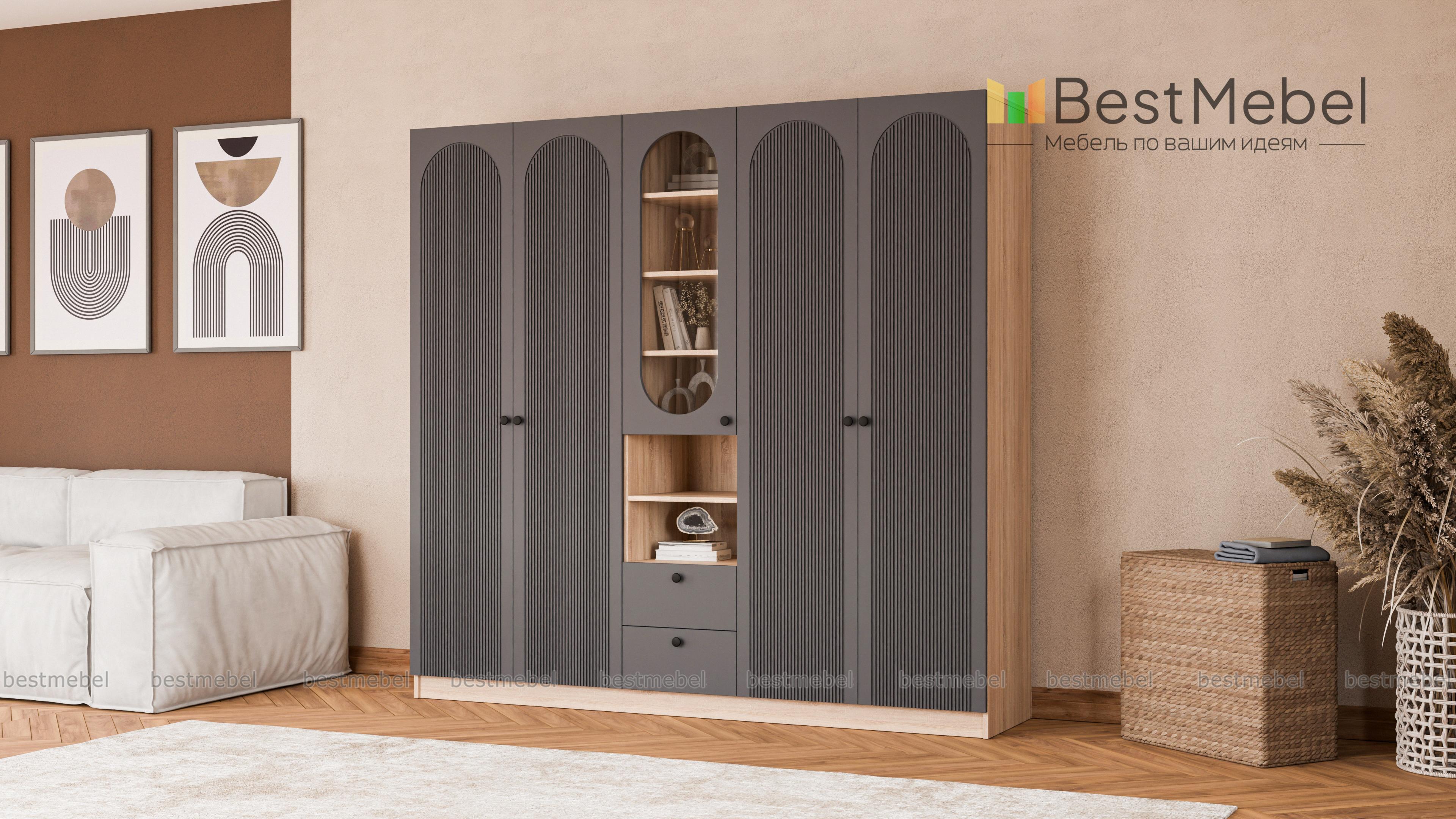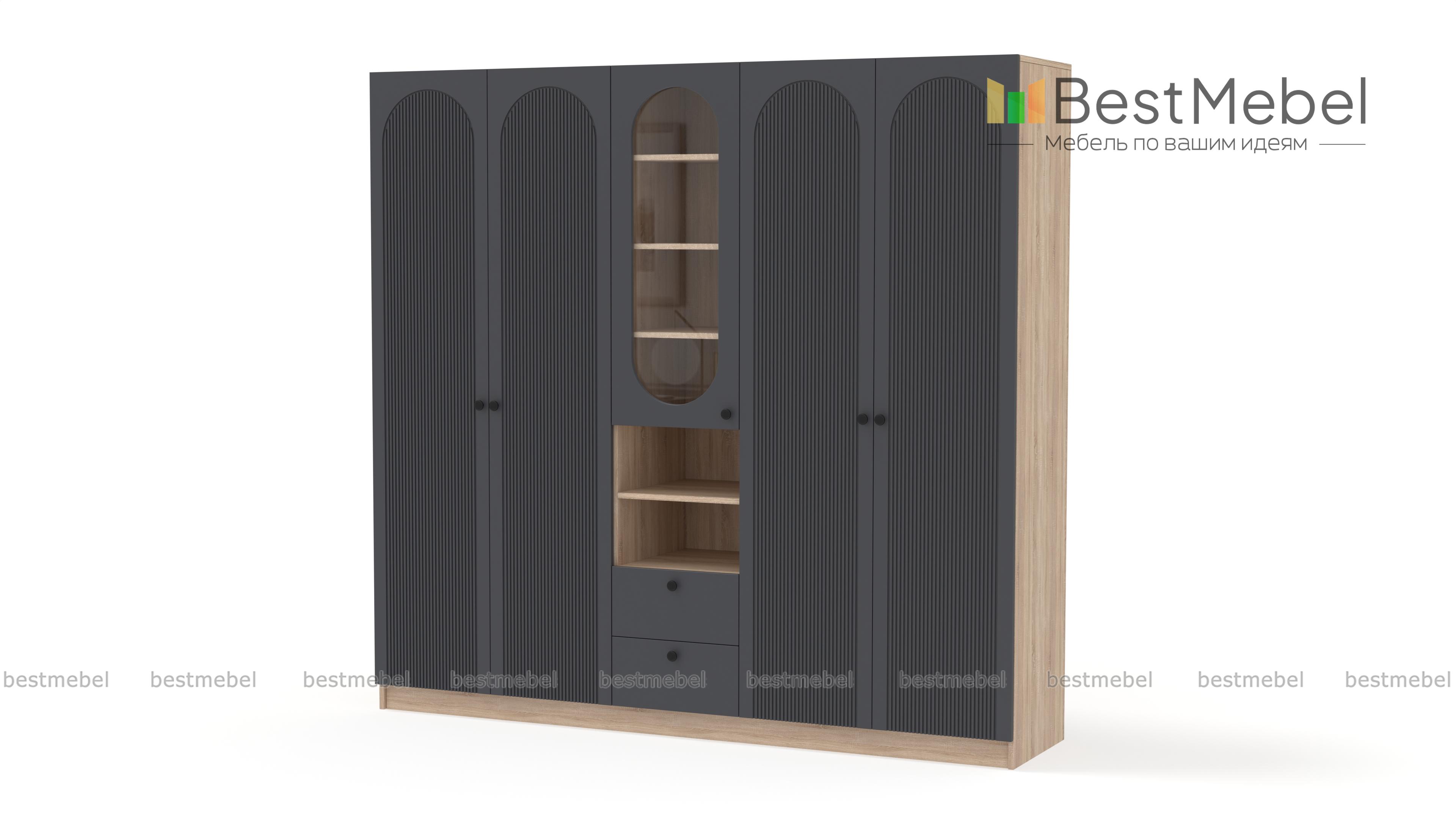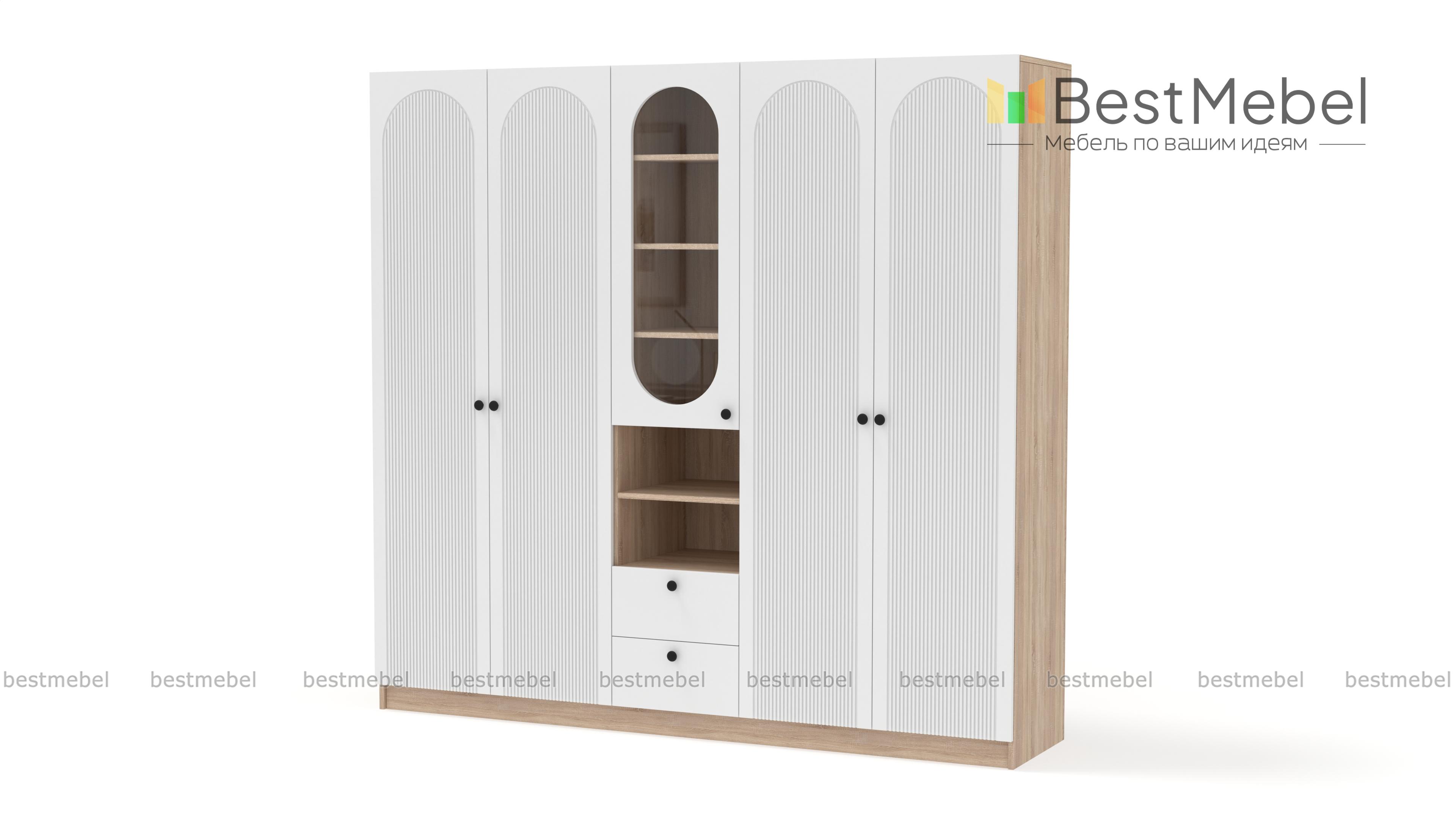 Шкаф распашной Рене 15 BMS — это композиция для гостиной или спальни, объединившая двухдверные отделения для одежды и комбинированную с ящиками и полками витрину. В одном месте будут компактно храниться предметы гардероба, важные мелочи, книги и еще многое другое. Фрезеровка на дверцах шкафа, выполненных из МДФ, повторяет форму изящных вырезов витрин. Купить шкаф распашной Рене 15 BMS, изготовленный по вашим размерам из качественных материалов, приглашаем в наш интернет-магазин.