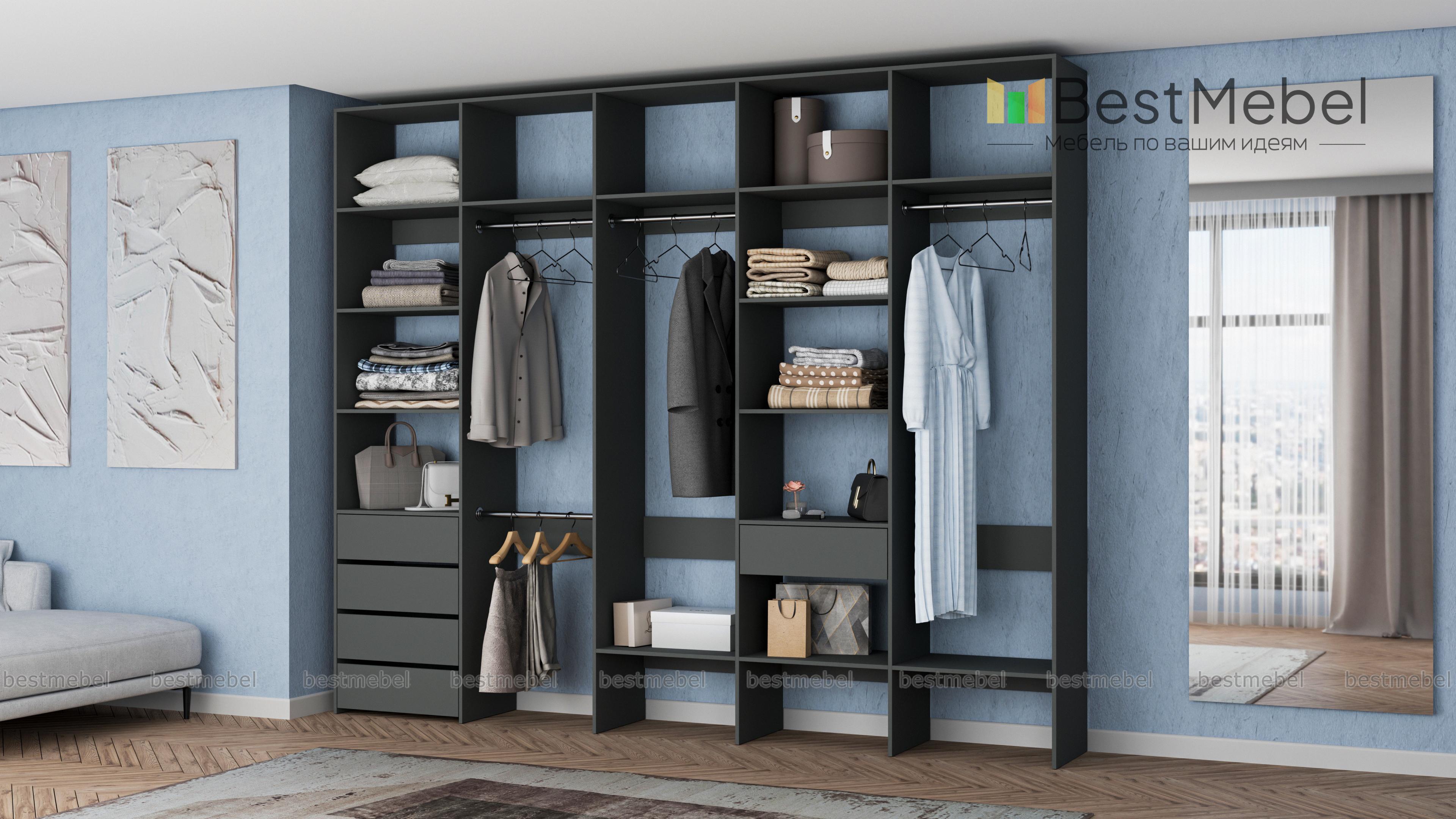 Стеллаж для одежды Мирта 73 BMS удобно зонирует пространство для хранения. Четыре штанги и полки позволят рассортировать одежду по категориям, расположенные на нижнем уровне полки удобны для создания обувниц, а в ящики можно убрать аксессуары, белье и другие мелочи. Дизайн стеллажа лаконичен и универсален, а поверхности из ламинированной ДСП устойчивы к влаге и появлению царапин. Купить стеллаж для одежды Мирта 73 BMS, изготовленный по вашим размерам, вы сможете в нашем интернет-магазине.