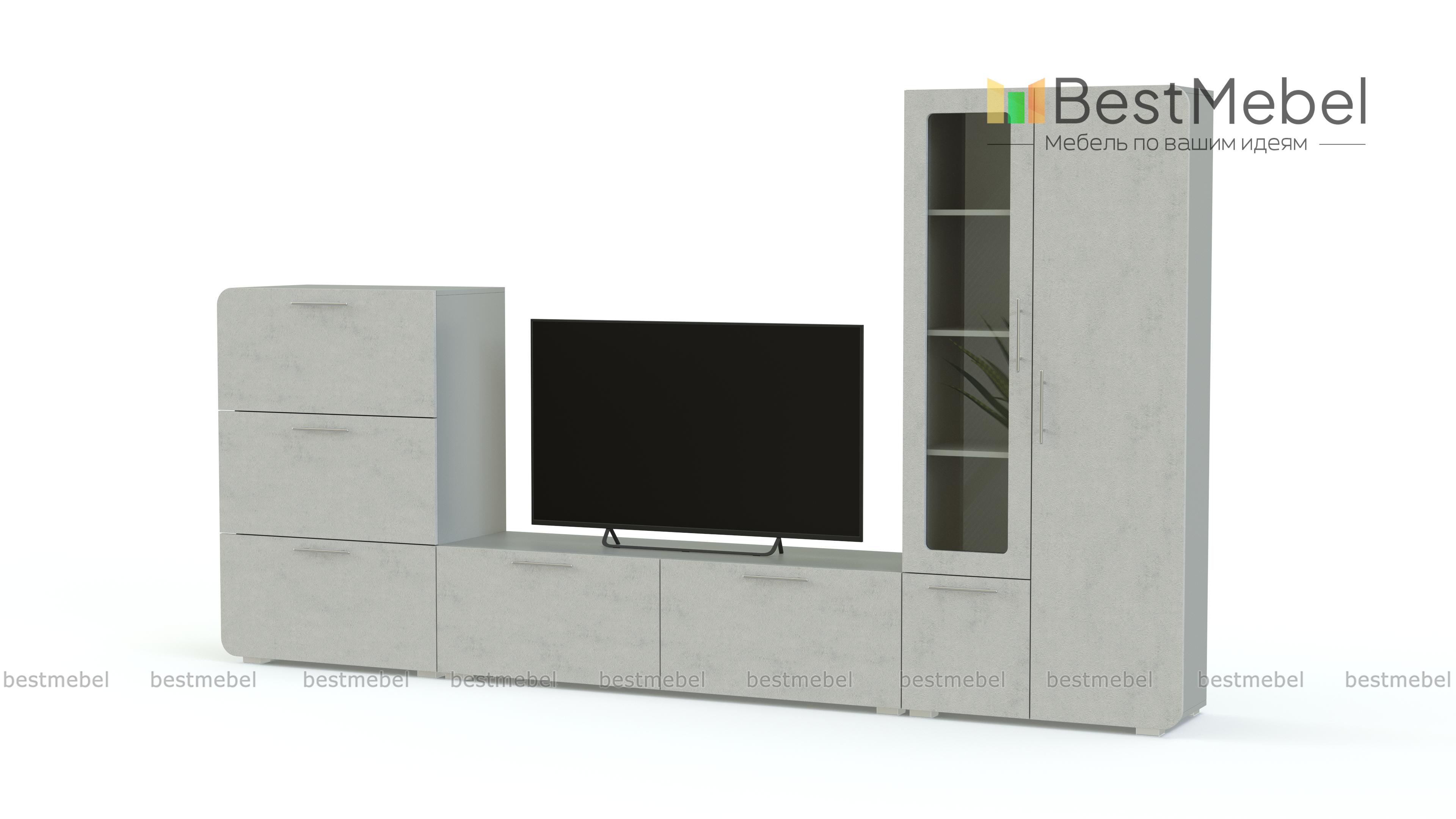 Стенка Модерно 14.1 BMS – компактная модель, которая отлично впишется даже в малогабаритные гостиные благодаря практичной модульной конструкции. В комплект входят низкая тумба для ТВ с просторной столешницей и двумя закрытыми отделениями, высокая тумба с выдвижными ящиками и комбинированный с застекленной витриной шкафчик. Расцветку для матовых скругленных фасадов вы сможете подобрать самостоятельно. Купить стенку Модерно 14.1 BMS приглашаем в наш интернет-магазин.