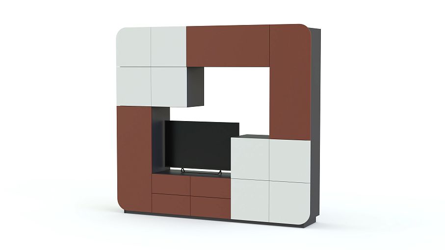 Необычный дизайн модели Пенелопа-4 BMS оценят поклонники минимализма и стиля хай-тэк. Контрастная яркая расцветка, гладкие матовые фасады и обтекаемая форма станут органичным дополнением ультрасовременной гостиной. В комплект входят расположенные по периметру отдельные модули – разнообразные закрытые отделения и выдвижные ящики. Расположенный в центре композиции ТВ становится ее частью. Дверцы и ящики без ручек открываются с помощью нажатия на фасад.