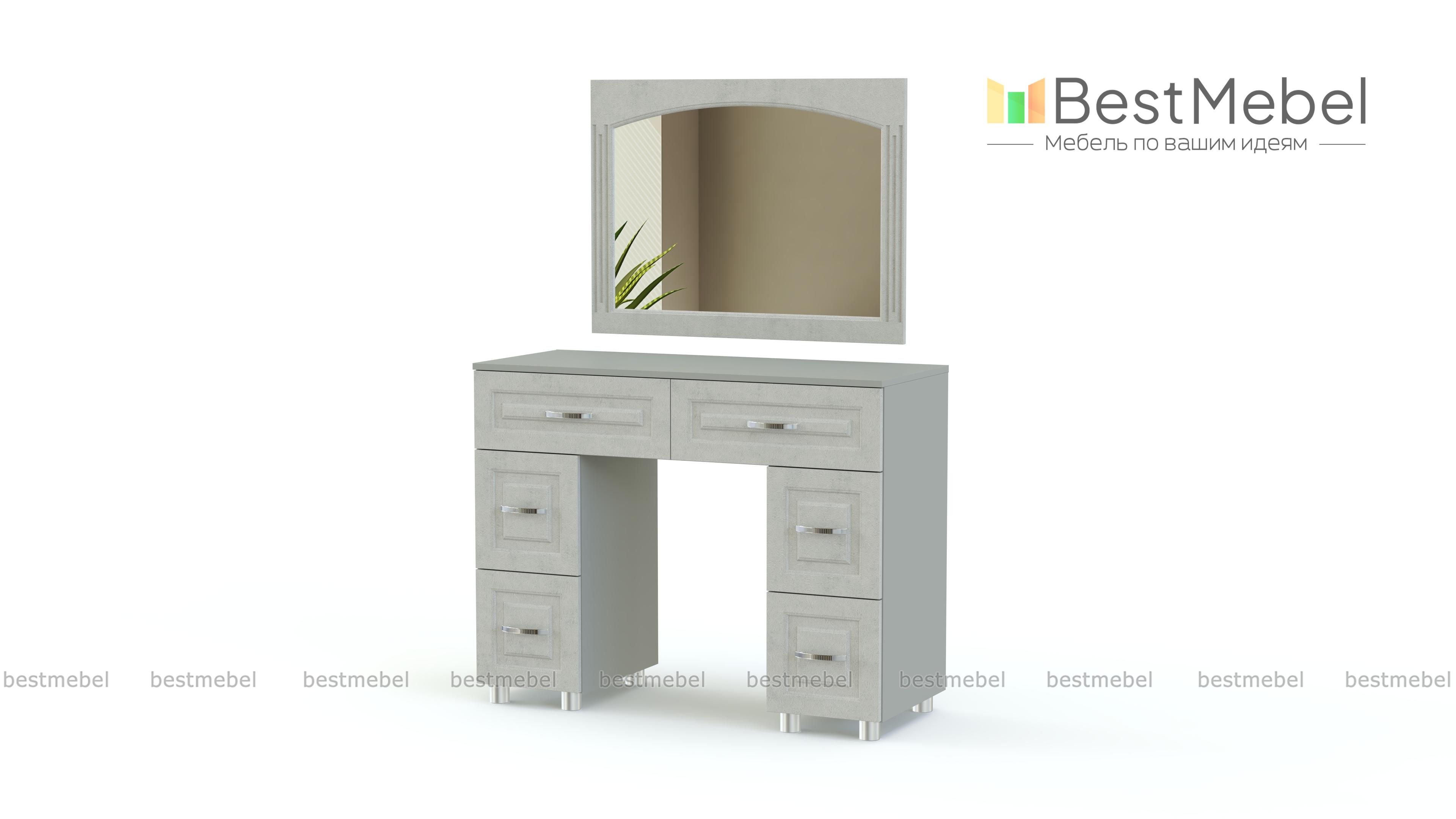Туалетный стол Элизабет Композиция 2 BMS – это двухтумбовая модель с широкой столешницей, двумя большими и четырьмя малыми выдвижными ящиками. Дополненный навесным зеркалом в элегантной раме, столик сделает уход за собой комфортным и украсит спальный интерьер. Выполненная в универсальных светлых тонах, модель декорирована классической рамочной фрезеровкой и располагается на регулируемых пластиковых ножках. Купить туалетный стол Элизабет Композиция 2 BMS приглашаем в наш интернет-магазин.