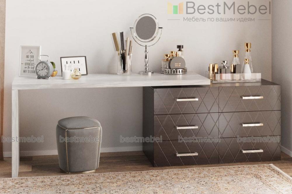 Туалетный столик Сая BMS сочетает в себе современный дизайн и функциональность. Модель, объединившая комод с шестью выдвижными ящиками и просторную столешницу, не только разместит большое количество вещей, но и может использоваться для работы, творчества или ухода за собой. Строгие линии композиции подчеркивает сочетание нейтрального темно-серого и контрастной белой столешницы, фасады комода декорированы фрезеровкой. Купить туалетный столик Сая BMS приглашаем в наш интернет-магазин.