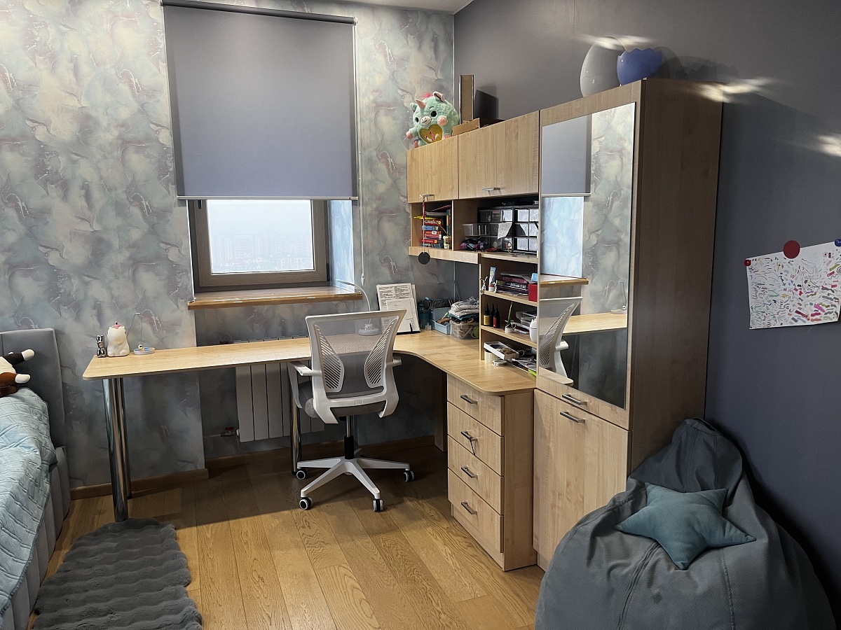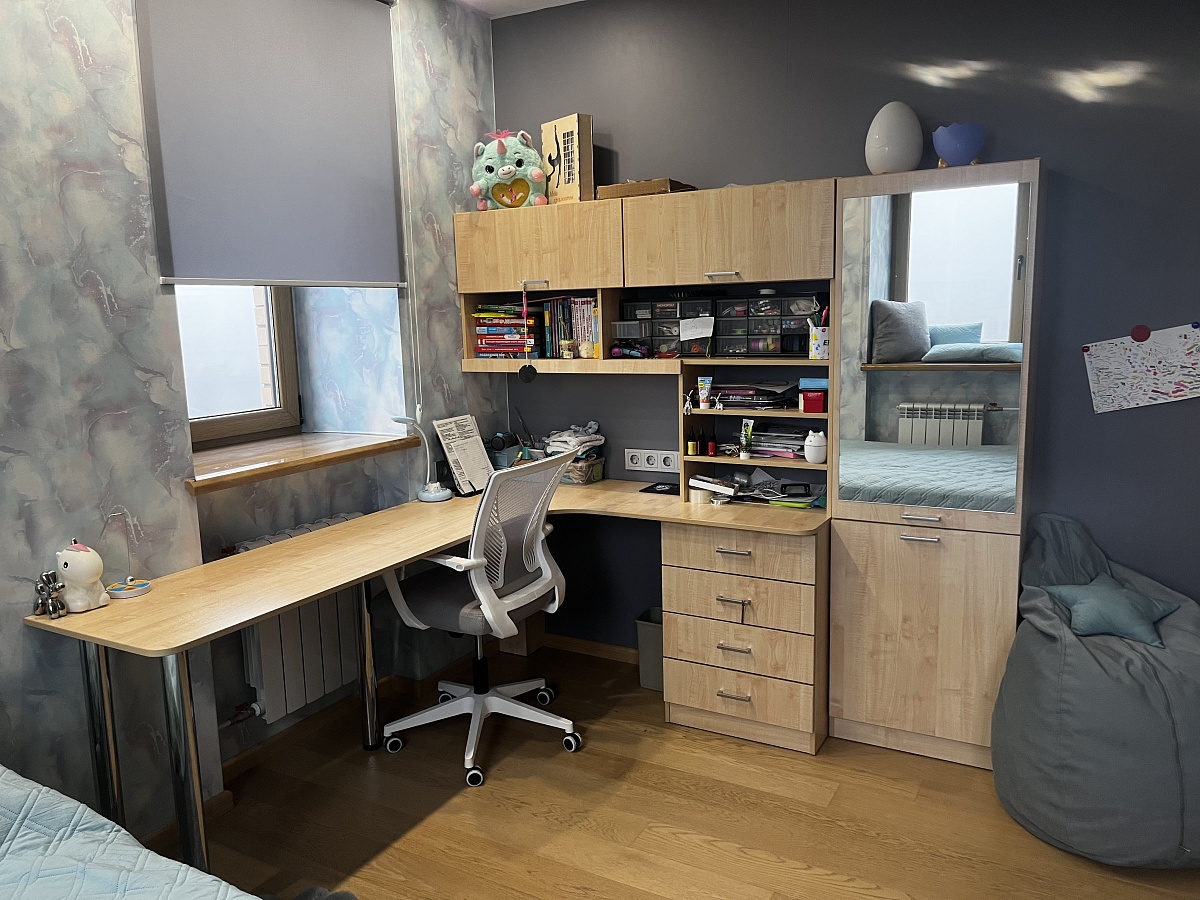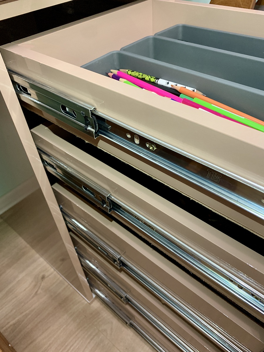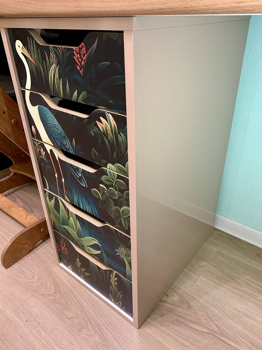 в этом заказе всё индивидуально: глянцевый корпус, в т.ч. задняя стенка, скрытые крепежи, шариковые направляющие с доводчиком, фотопечать, материал мдф. Получилось мощно! Мы довольны. Выполняет функцию разделителя под детским столом.