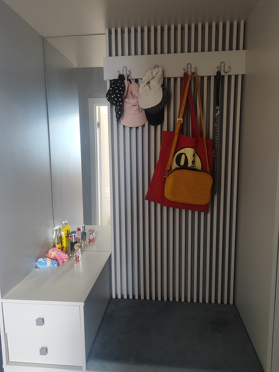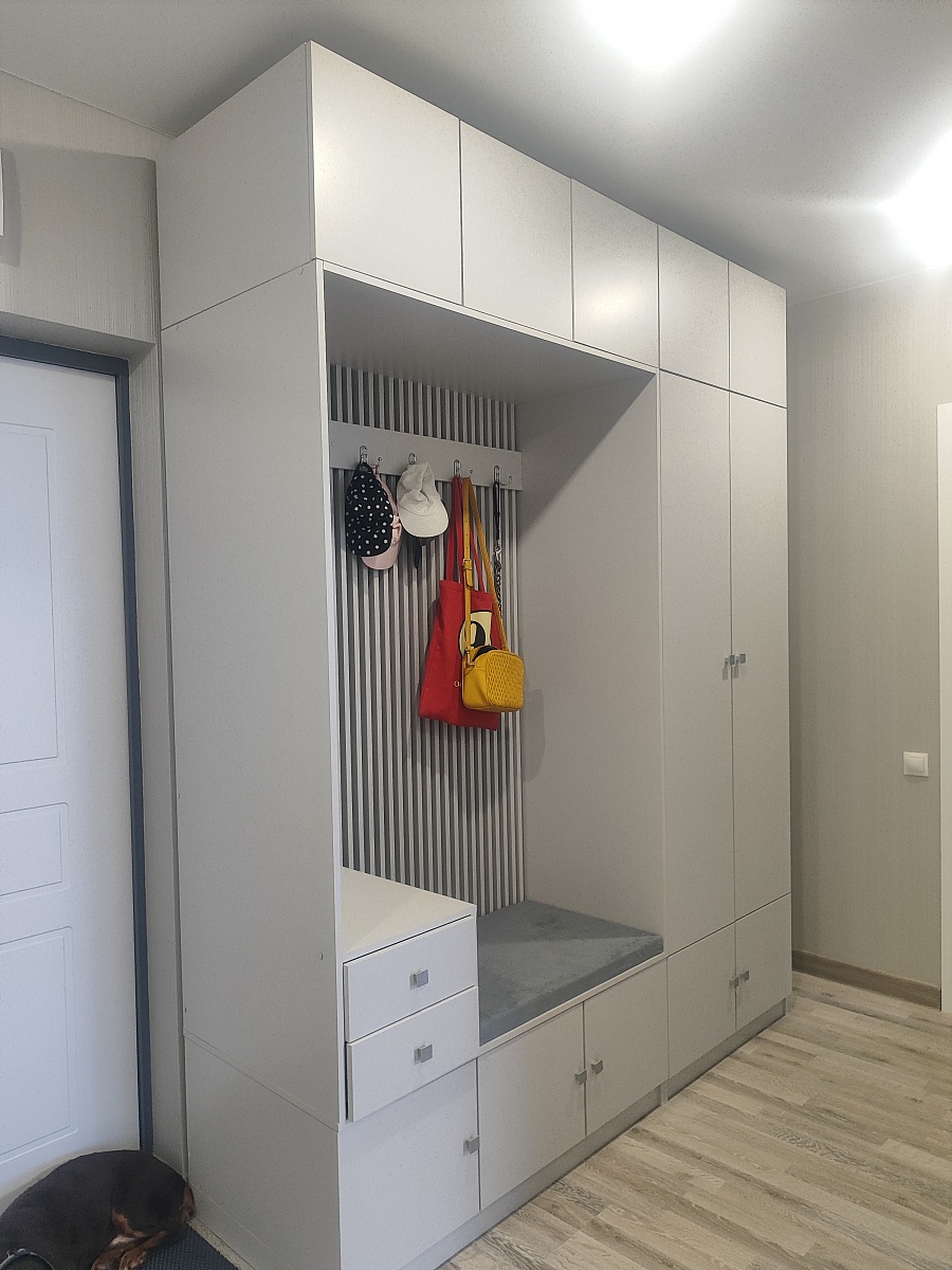Заказ 00000103349.Взяли прихожую "Дублин 34 BMS" и в целом очень довольны, но сборка – это отдельная история. Главный плюс, который нас покорил – возможность заказать точный размер и цвет. У нас прихожая довольно узкая, и стандартные варианты просто не подходили. Сделали под наши замеры – встала идеально, как будто так и было задумано. Цвет выбрали серый – смотрится очень стильно, современно и правда делает маленькое пространство светлее и визуально просторнее. Функционально – все отлично. Места хранения действительно много: и верхние, и нижние шкафы легко вмещают все куртки, даже толстые зимние. Платяное отделение – спасение для вещей, которые не хочется мять. Очень удобна открытая вешалка с большим зеркалом – можно быстро что-то повесить или посмотреть на себя перед выходом, не бегая в ванную. Ящики внизу здорово организовали всю мелочь – перчатки, шапки, шарфы теперь не теряются. Качество на вид хорошее: фасады ровные, фурнитура пока не подводит (доводчики и шариковые направляющие). Но есть один существенный минус – сборка. Деталей очень много. Когда распаковали все коробки, немного растерялись от количества упаковок и элементов. Инструкция вроде понятная, но сам процесс требует времени, терпения и много свободного места. Собирать в одиночку – крайне сложно и долго.Нам с мужем пришлось потратить почти целый день, работая вдвоем, и это было довольно напряжно. Если вы один или не уверены в своих силах – советую сразу закладывать стоимость сборки мастера или звать очень опытного помощника.Если вы готовы к сборке (или закажете ее) – это отличный вариант для организации порядка в прихожей. Мы довольны результатом, хоть и пришлось попотеть. Выглядит дороже, чем стоит!